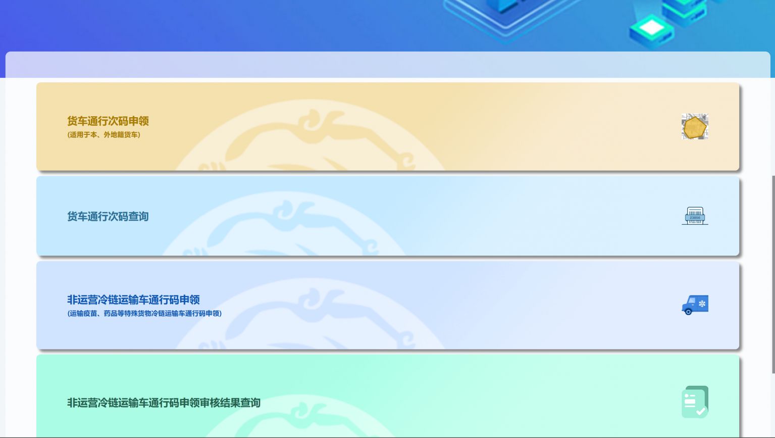 (一)国VI货车通行码、国V货车通行码、国Ⅳ货车通行码(非营运冷链运输车除外)申领程序
